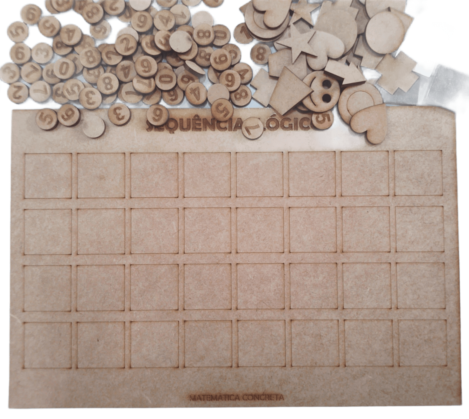 O quadro Sequência Lógica tem o objetivo de ampliar as possibilidades de trabalhar o pensamento lógico, desde a infância. Além disso, ele permite que as crianças joguem entre si, criando desafios, uns para os outros, estimulando, além do raciocínio lógico, a criatividade. O quadro vem com peças de cores, formatos e números variados. Assim, é possível iniciar com combinações de cores e ir evoluindo para combinações de formatos e números. Na série numérica é possível trabalhar combinações que envolvem conceitos de par e ímpar, números primos, multiplicação, divisão.